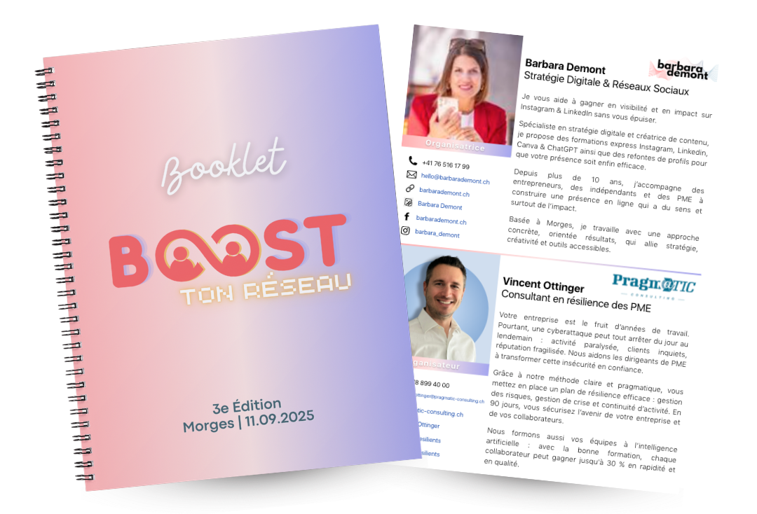 A la suite de la soirée, tu reçois le booklet numérique contenant des offres exclusives ainsi que les contacts des participant·e·s  pour prolonger les échanges.
